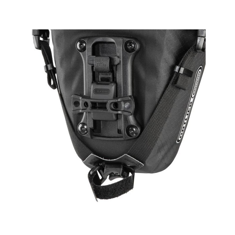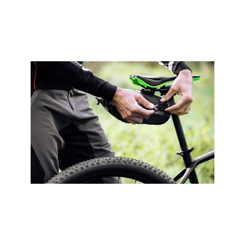 La Saddle-Bag viene fissata direttamente alla sella con il sistema di chiusura a scatto regolabile. L-adattatore è particolarmente scorrevole e consente un rapido montaggio e smontaggio. Inoltre, la chiusura a scatto è compatibile con il modello precedente della Saddle-Bag - quindi può essere utilizzata, ad esempio, per diverse biciclette. Una cinghia in velcro sul reggisella garantisce una maggiore stabilità e impedisce l-oscillazione indesiderata avanti e indietro. Un ulteriore vantaggio: la grande borsa da sella sostituisce quasi completamente il parafango posteriore e trattiene gran parte degli spruzzi d-acqua.