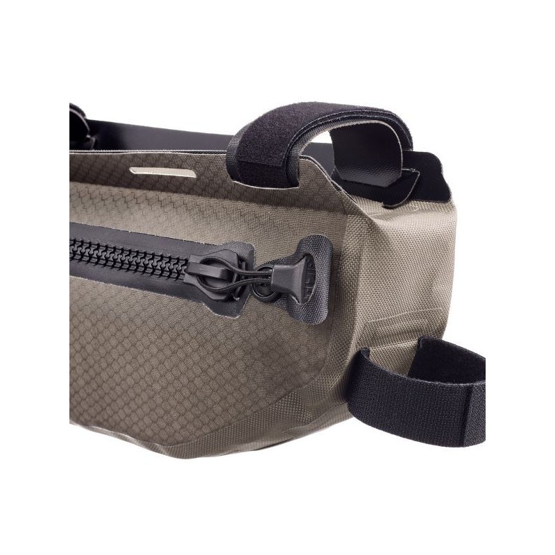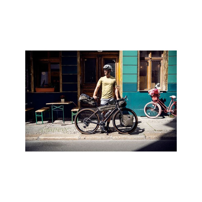 La soluzione ragionata per tutti coloro che portano sì il bagaglio sul telaio, ma non rinunciano alla borraccia a portata di mano. Anche i possessori di mountain bike full suspension, che dispongono di uno spazio limitato, possono usare questo bagaglio sul telaio. Il Frame-Pack Toptube di ORTLIEB offre spazio sufficiente per oggetti pesanti come i picchetti della tenda, attrezzi o provviste, che vengono fissati alla ruota con un baricentro molto basso. Non solo la borsa è impermeabile, ma anche la chiusura lampo, così che nemmeno l’attraversamento di un fiume possa fermare il vostro viaggio.