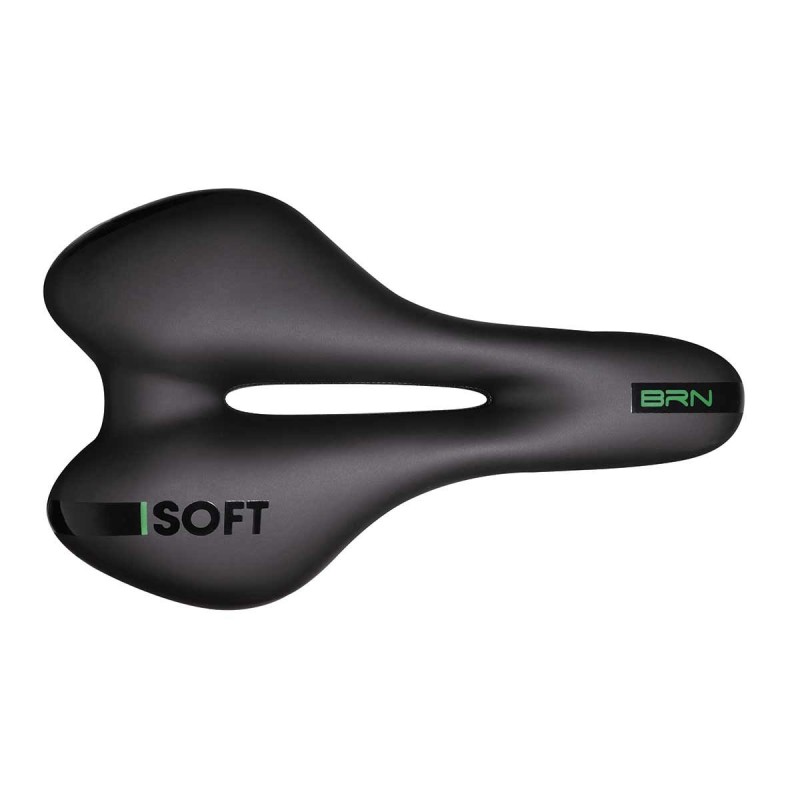 Sella BRN Dynamic Sport Soft Uomo poggiata su un telaio in acciaio e rivestita in microfibra. Le sue dimensioni sono 275 x 155 mm ed il peso è di 355 g.
