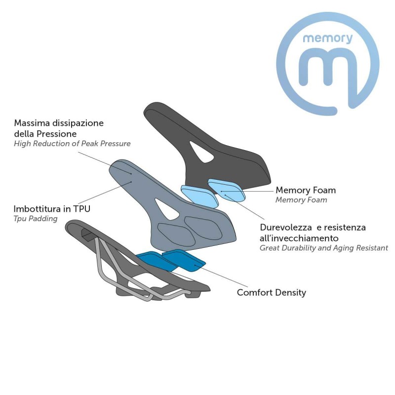 Sella BRN Memory Foam Flow nera unisex modello Relax. Il "Memory Foam" è un materiale termosensibile visco/elastico che ha la peculiarità di tenere in memoria la forma adattandosi perfettamente alla linea del corpo. Questo materiale ha la capacità di distribuire la pressione uniformemente, ridurre la compressione e alleviare le tensioni muscolari. Solitamente il Memory Foam è abbinato a strati di altri materiali (in genere poliuretani) che contribuiscono a migliorare il comfort della sella. Lo scafo è realizzato con due materiali di diverse pro prietà strutturali elastiche (Nylon e Poliuretano), che permettono di irrigidire la base, dove lo stress è maggiore, rendendola più elastica e confortevole nei punti di pressione della seduta. I due elastomeri sono realizzati con una tecnologia all’avanguardia in grado di racchiudere all’interno della struttura poliuretanica termoplastica (TPU) migliaia di bolle d’aria, che contribuiscono ad assorbire le sollecitazioni senza stressare il corpo.