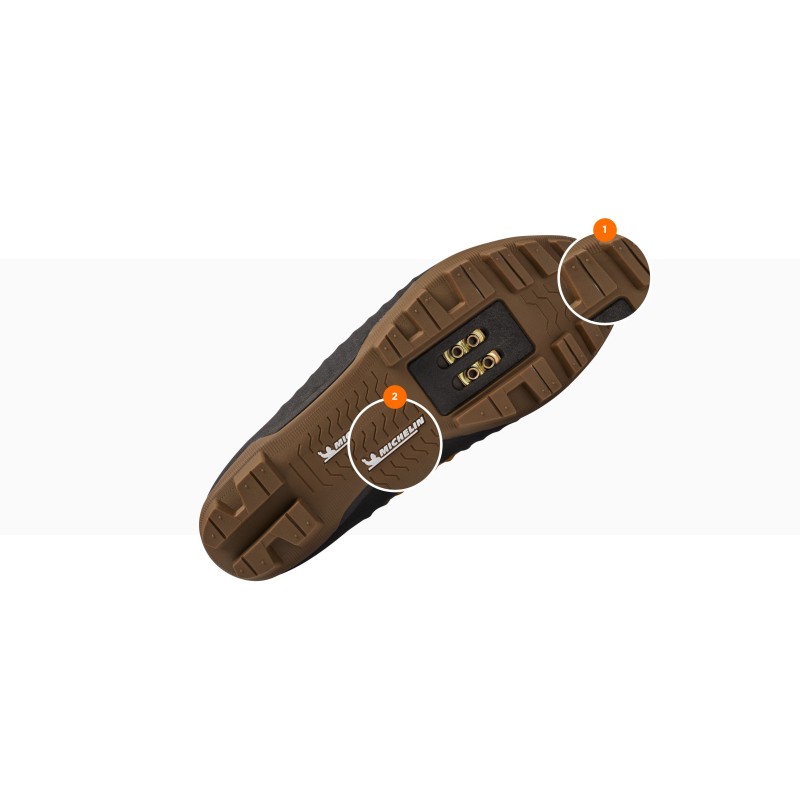 Costruzione totalmente a maglia per una scarpa molto leggera con grande traspirabilità che ha sufficiente elasticità per adattarsi perfettamente alla forma del tuo piede. Lacci integrati, riflettenti e rinforzati per la protezione dal fango e dall’abrasione dove è più importante. La suola Michelin® a doppia rigidità, con un design del battistrada composto da un particolare compound e una specifica geometria dei tappi, è stato progettato per offrire trazione e aderenza quando è necessario il controllo con piede a terra e quando si scende dalla bici.