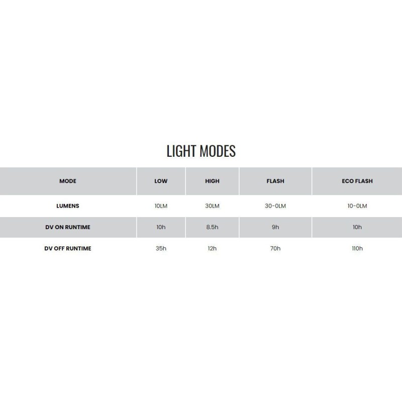 - E quando la potenza della batteria residua è inferiore al 10%, la modalità di illuminazione cambia in modalità ECO FLASH. La funzione video è disabilitata