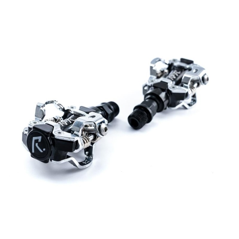 Pedale forgiato a sgancio rapido con sistema di aggancio bifacciale e perno in CrMo lavorato a CNC. Compatibile con SPD.