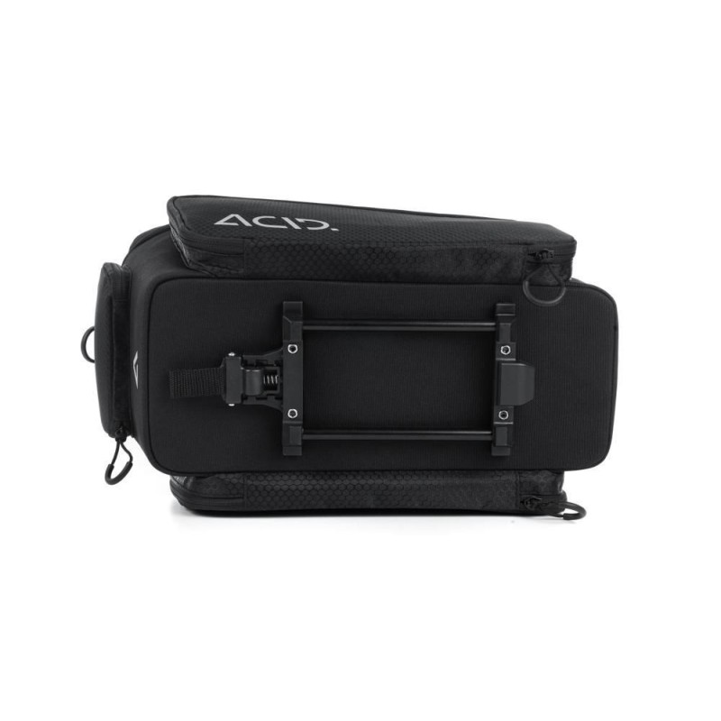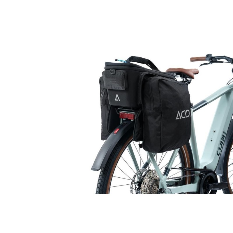 compatibile con tutti i vettori RILink di ACID e CUBE; ACIDO RILink; borse laterali avvolgibili; scomparto principale espandibile; cinghia di fissaggio in gomma; tracolla; dettagli riflettenti; portabottiglie; copertura antipioggia